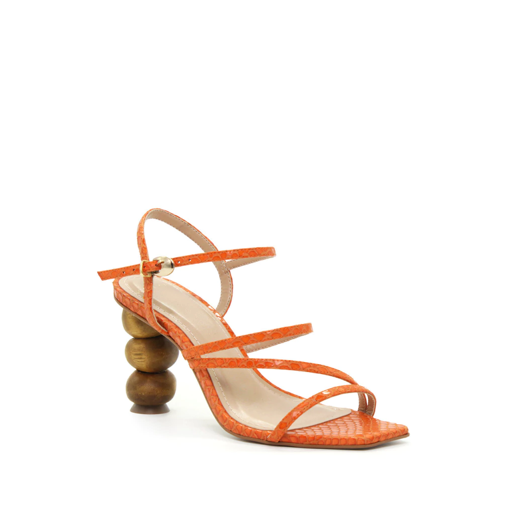A Avelin em couro escama laranja apresenta um visual marcante e sofisticado, combinando o brilho natural da textura com o design artístico do salto escultural com pintura de madeira no tamanho 9,1 cm. As tiras finas criam uma estrutura leve e elegante, destacando o equilíbrio entre formas delicadas e volumes orgânicos. O tom laranja adiciona energia e contemporaneidade, tornando o modelo ideal para composições que valorizam estilo e personalidade. Um calçado que transforma qualquer look em uma expressão de design e autenticidade.