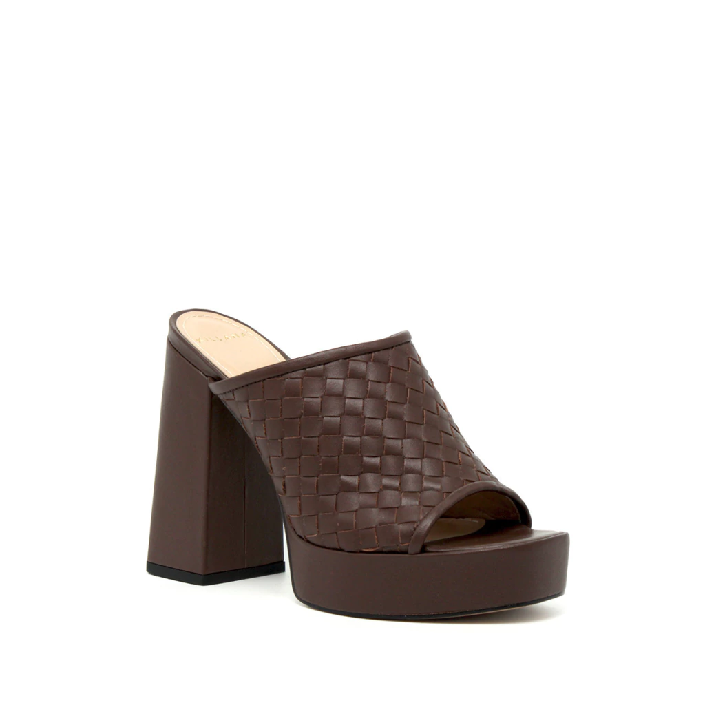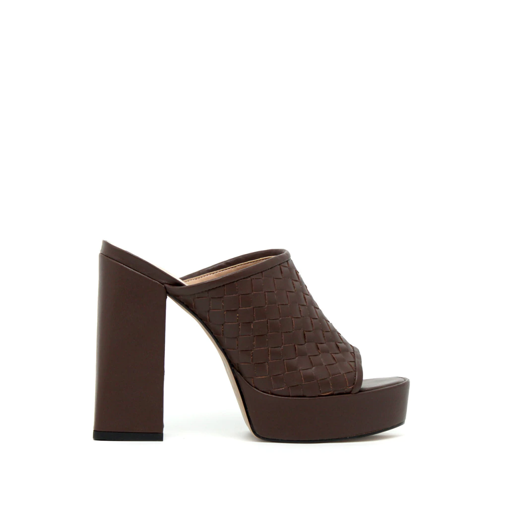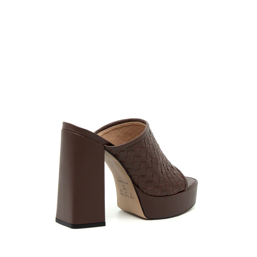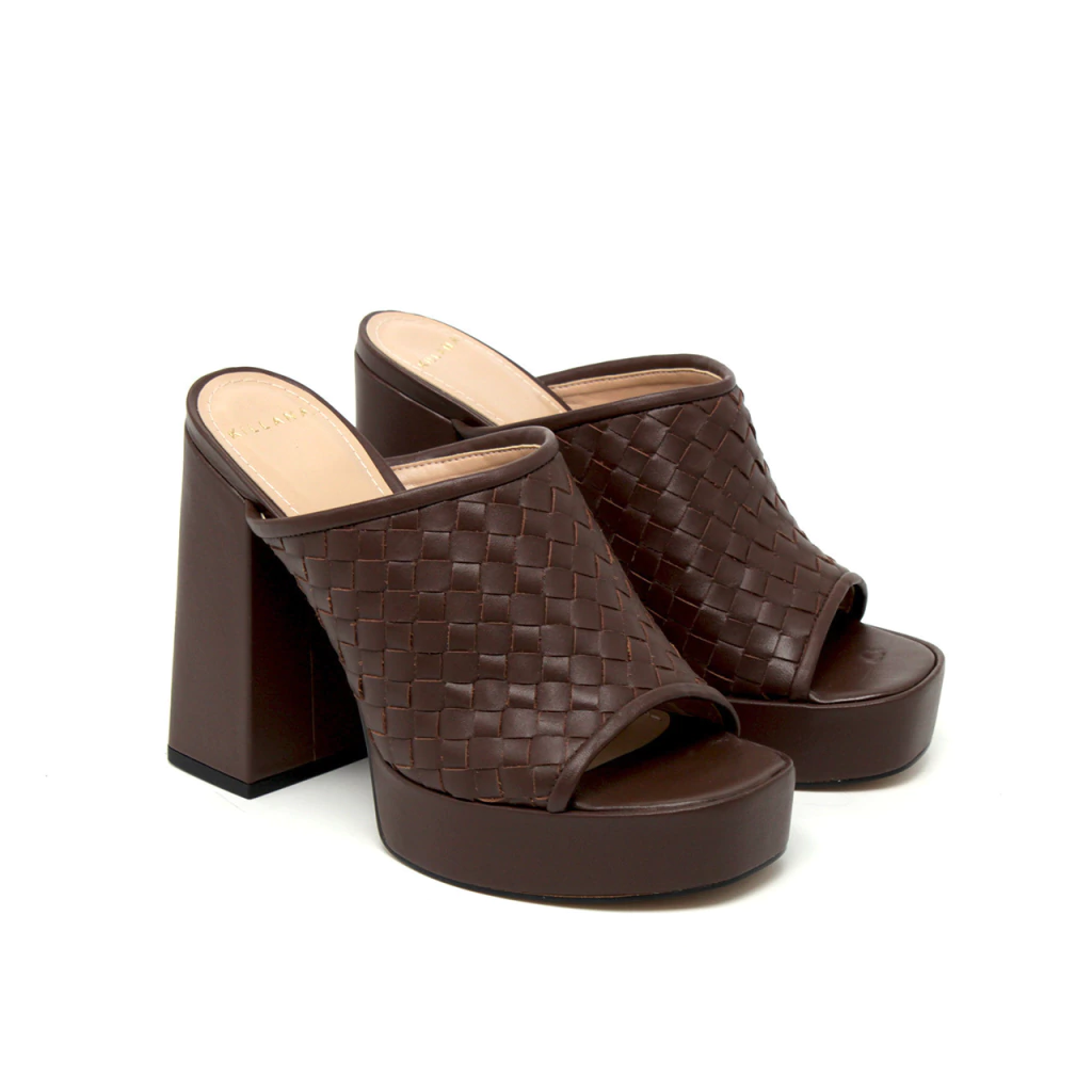 Destaques do produto: - Couro trançado feito à mão, valorizando o artesanato - Salto bloco de 13 cm com plataforma para estabilidade - Cor marrom café que combina com diversas paletas de cores - Design contemporâneo com toque escultural - Produção artesanal em couro nobre, garantindo qualidade e exclusividade