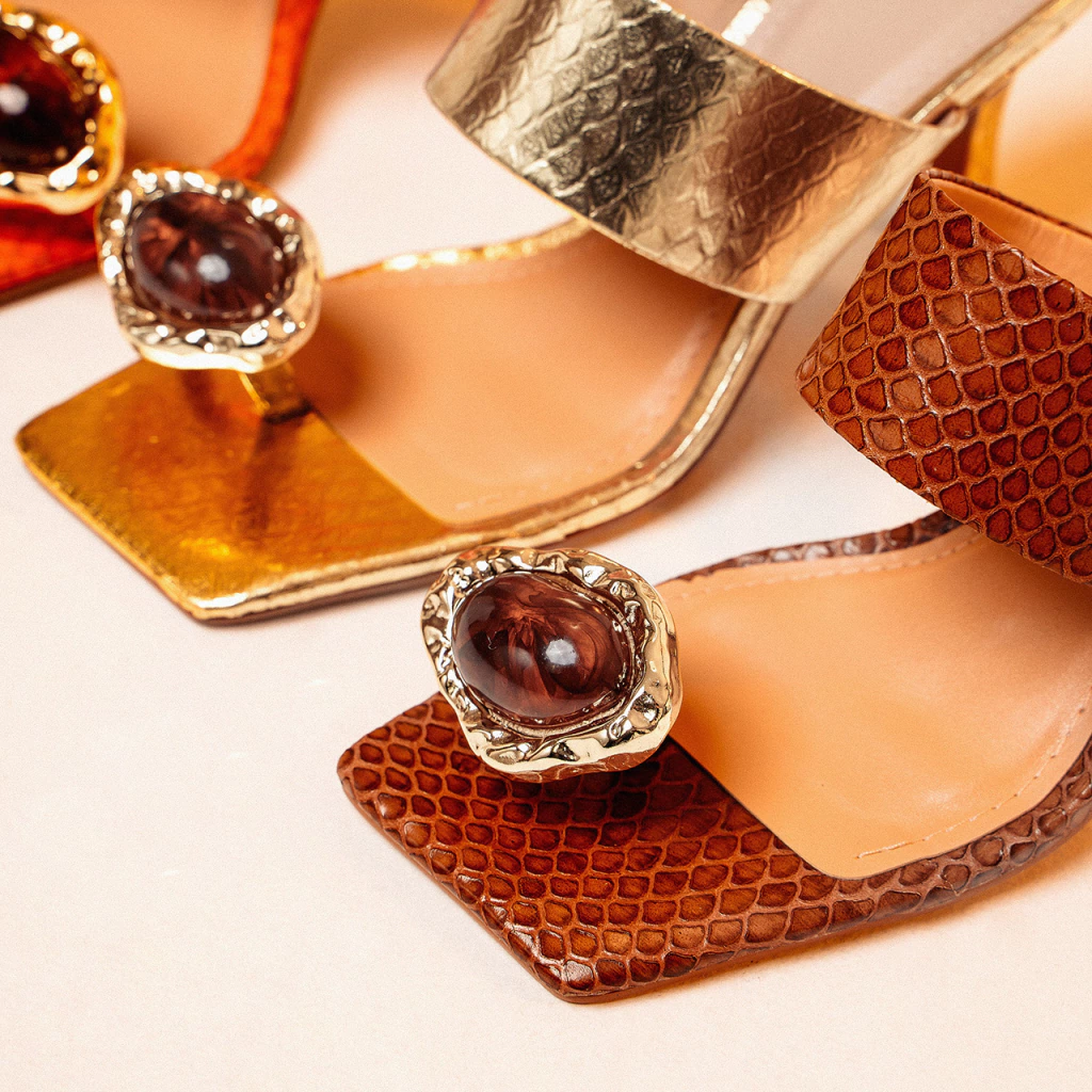 O trabalho artesanal em couro com textura escamada confere uma profundidade visual refinada, ressaltando a autenticidade e o requinte da peça. Um detalhe exclusivo em pedra, delicadamente envolto por uma moldura dourada, adiciona luminosidade e um toque artístico que eleva o tamanco a um patamar superior de elegância.