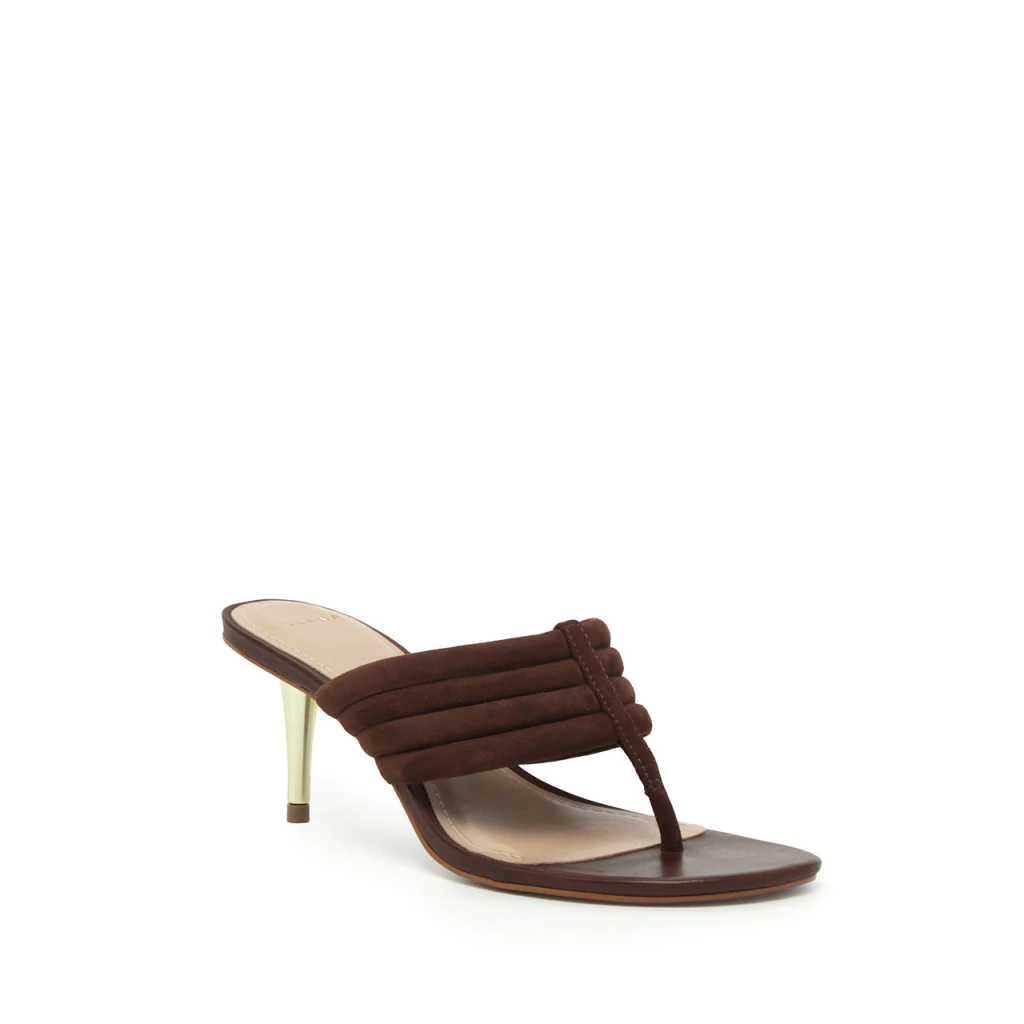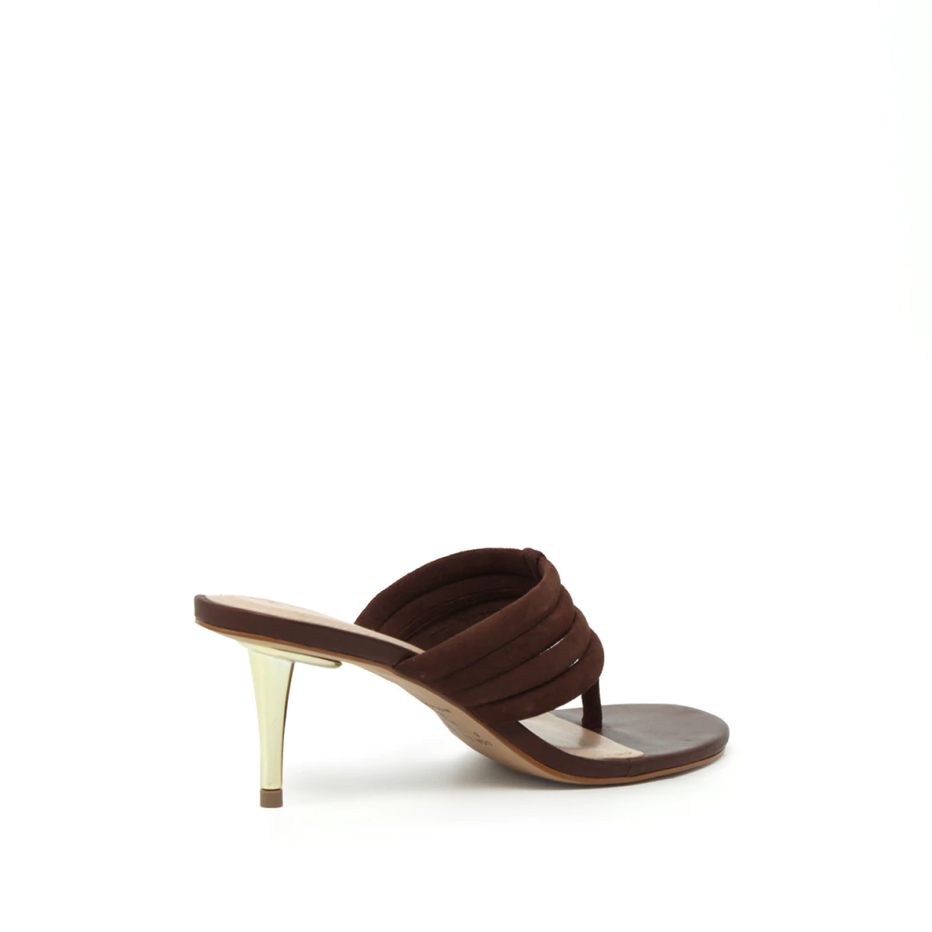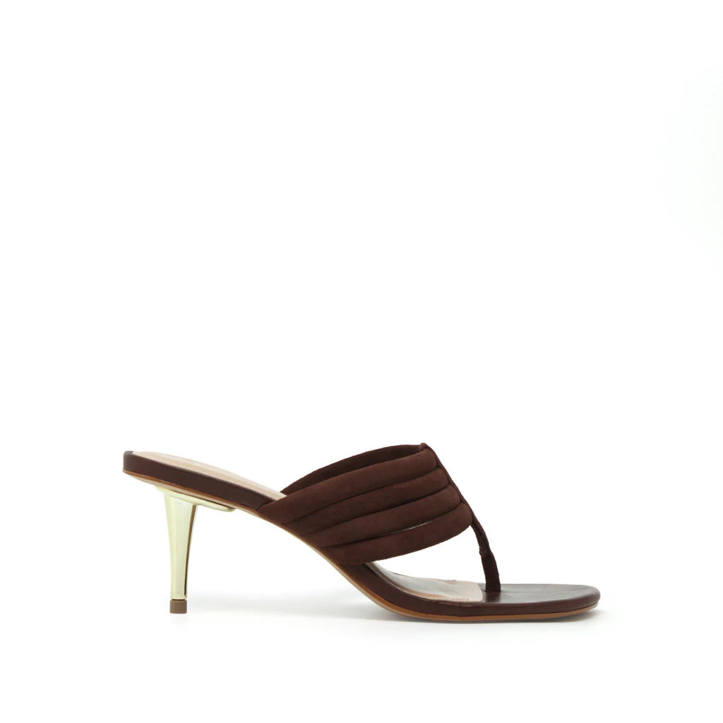 O formato thong, icônico dos anos 2000, é reinventado com delicadeza, enquanto as tiras acolchoadas em camurça criam um jogo de texturas que conferem volume e conforto ao mesmo tempo. O destaque fica por conta do salto agulha metálico dourado de 7,4 cm, que adiciona leveza e um brilho refinado, elevando qualquer produção com um toque de luxo discreto.
