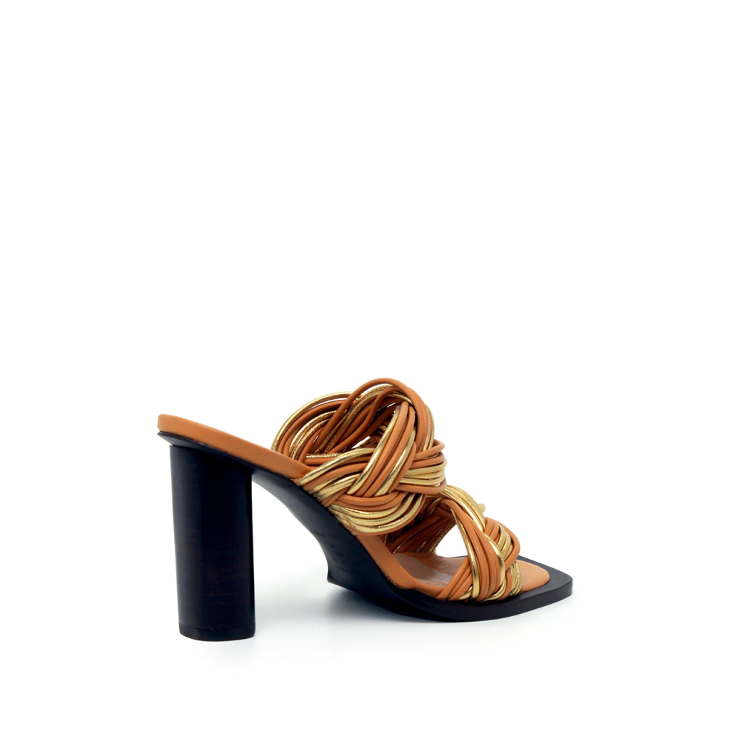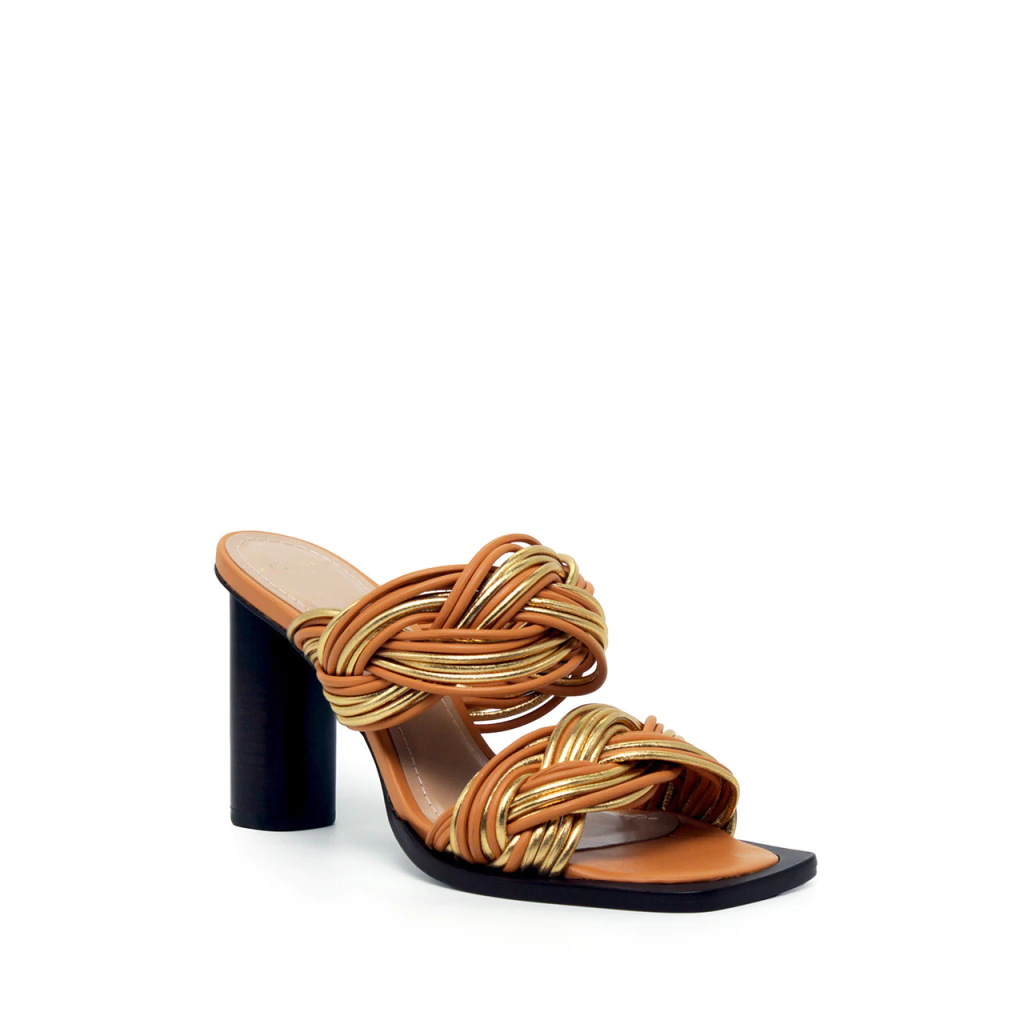 Destaques do produto: - Couro trançado artesanal em laranja tangerina e dourado - Salto bloco cilíndrico de 10 cm com acabamento amadeirado - Bico quadrado para um toque geométrico moderno - Design que une conforto, arte e sofisticação