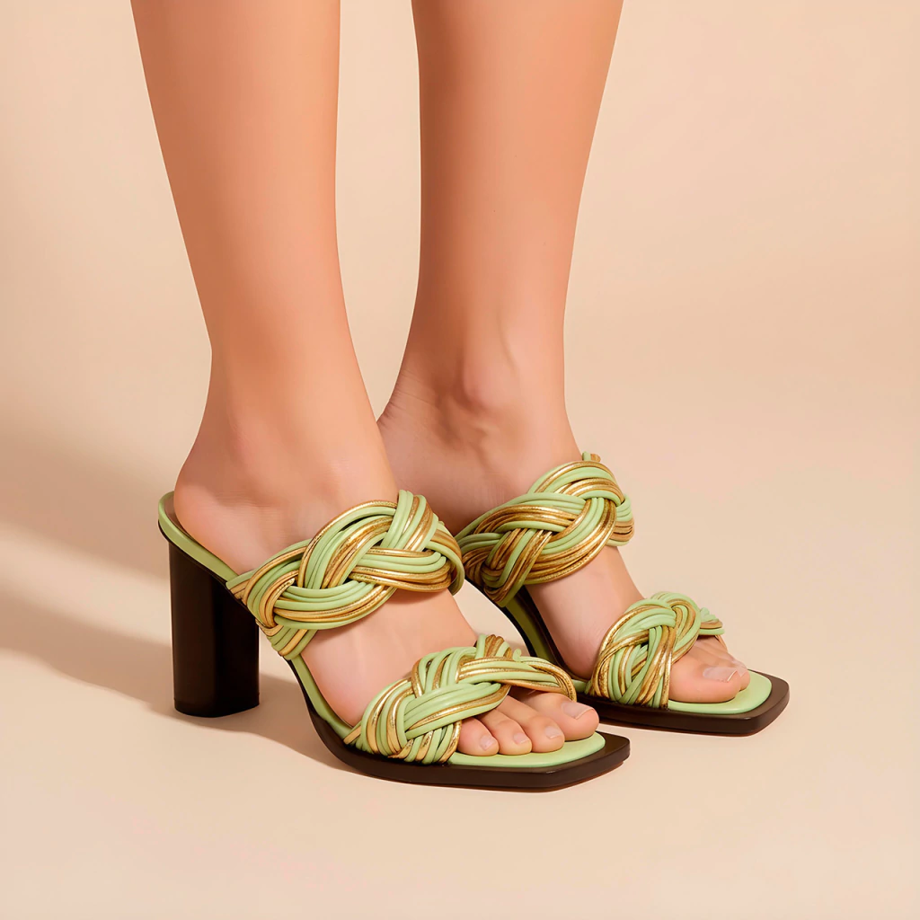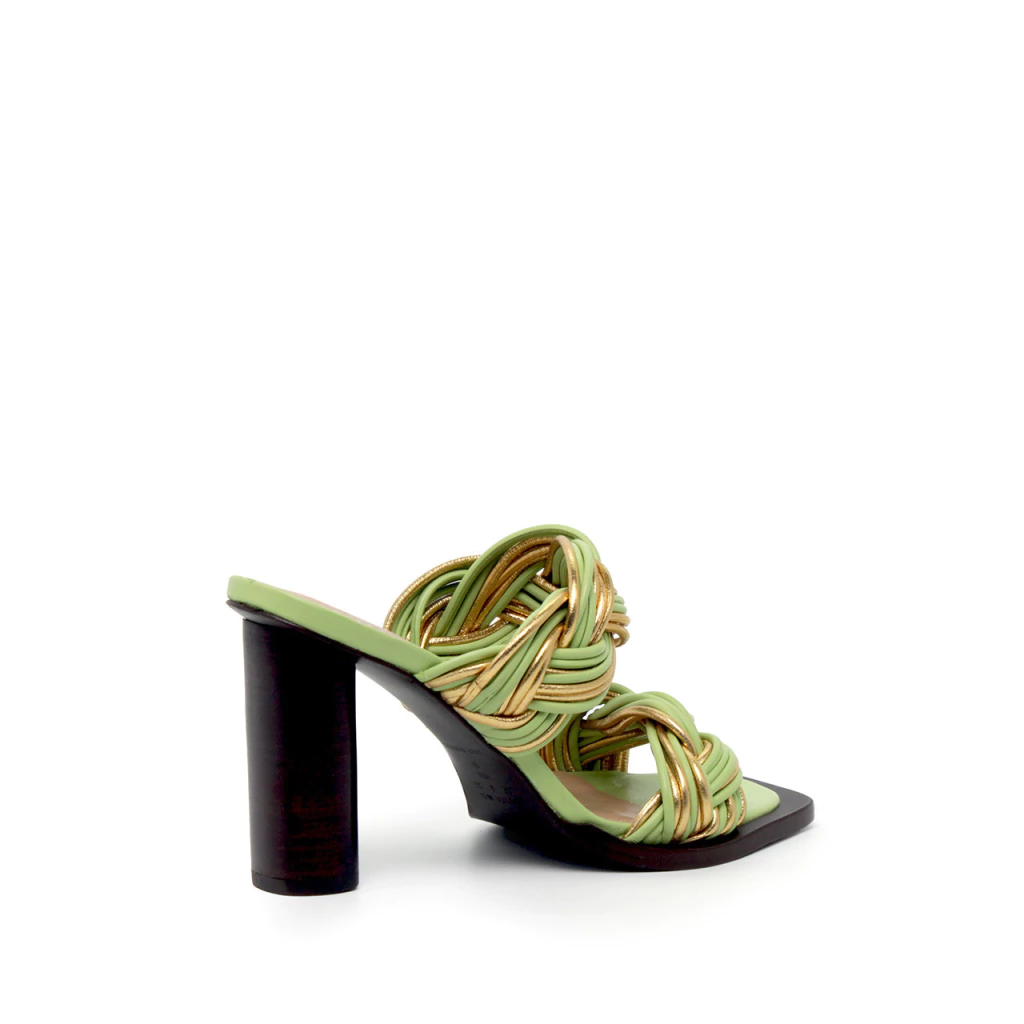 Principais atributos: - Couro verde maçã com detalhes dourados trançados à mão - Salto bloco cilíndrico de 10 cm com acabamento amadeirado - Bico quadrado para um visual moderno e geométrico - Design escultural que une movimento, leveza e presença