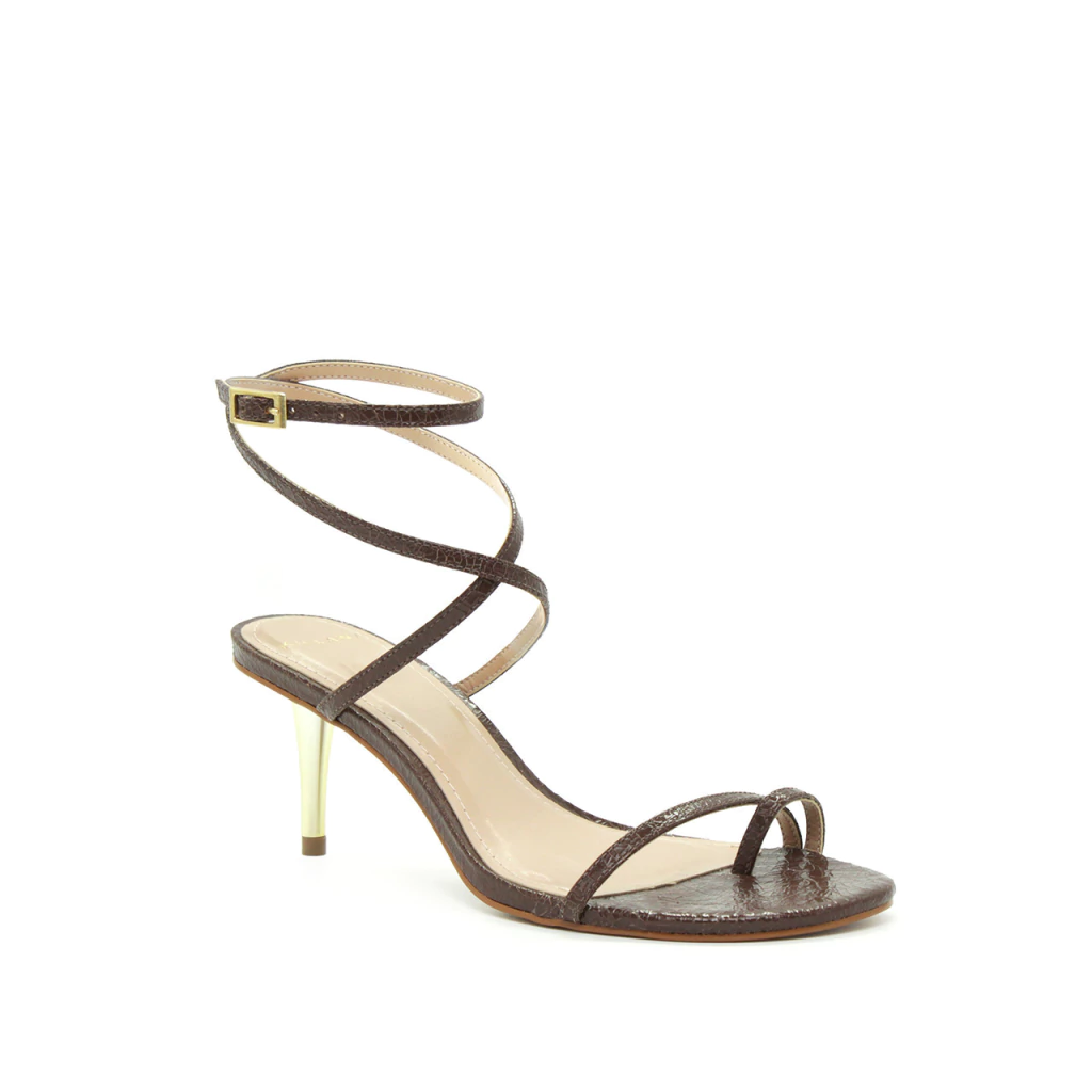 A Zel em marrom café apresenta um equilíbrio refinado entre simplicidade e impacto visual. Suas tiras finas contornam o pé com delicadeza, criando uma silhueta elegante e moderna. O salto metálico de 7,4 cm adiciona um toque escultural e sofisticado, contrastando de forma sutil com o tom profundo do couro. Ideal para produções que valorizam o design limpo e o acabamento impecável, a sandália se adapta com facilidade a looks de alfaiataria, vestidos fluidos ou combinações mais urbanas, elevando qualquer composição com elegância e modernidade.